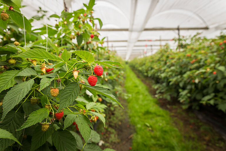 The fruit of the raspberry plant is red, tasty and sweet but tart-flavoured. Raspberries are a seasonal fruit and produced in summer or early autumn. Botanically speaking, the raspberry is not a berry, but an aggregate fruit of numerous drupelets around a central core.