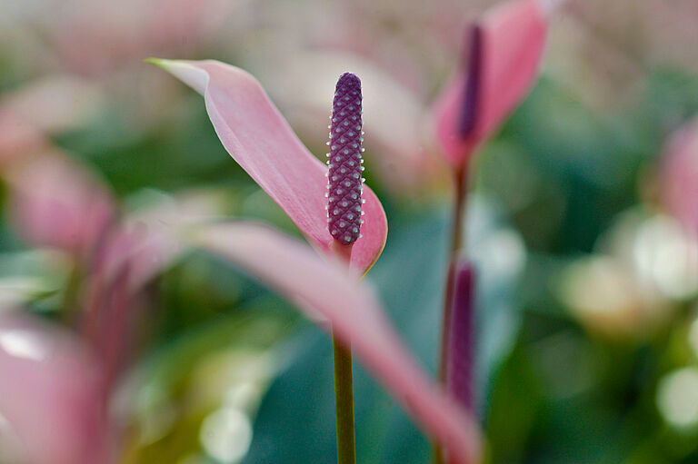 The actual flowers on the spadix are surrounded by four stamens and they have many pistils. These flowers are both bisexual and protogynous, which means that the spadix is going through a female phase first. A male phase follows after about a month. Standard varieties of anthuriums are recognized by its uniform colors and heart-shaped spathes. In many markets, red is the most popular color.