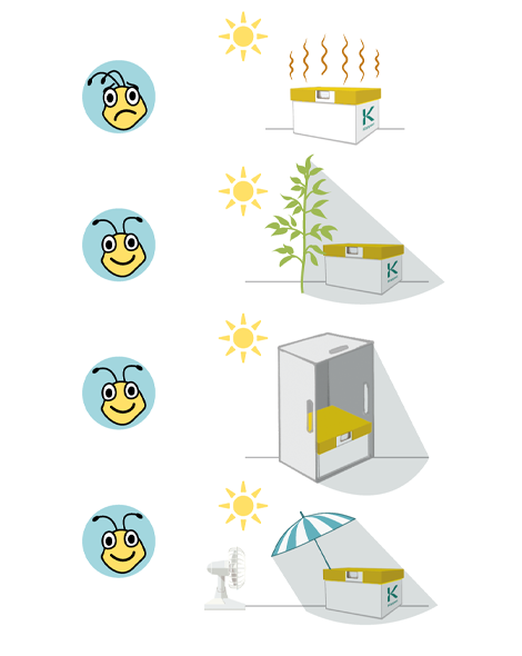 Bumblebees maintain a constant temperature in the hive. If the temperature to which they are exposed is too high for a lengthy period, the hive and the colony may suffer damage. You should therefore position the bumblebee hive in the coolest spot, or at least in the shade, particularly during the warmest part of the day. Ensure that the hive gets some sunlight during the dark winter period. Shade can be provided by the crop, a crate, or other screening methods. During periods with extreme temperatures, extra measures will be required such as active cooling.