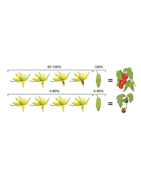 Pollen is released best at a relative humidity (RH) of between 50% and 80%. A relative humidity of more than 80%-85% will result in pollen not being released and the bumblebees will become inactive. Below 50% RH, the germination capacity of the pollen decreases, potentially resulting in problems with fruit setting. The bumblebees will still collect pollen, and leave bite marks, but no fruit will grow.