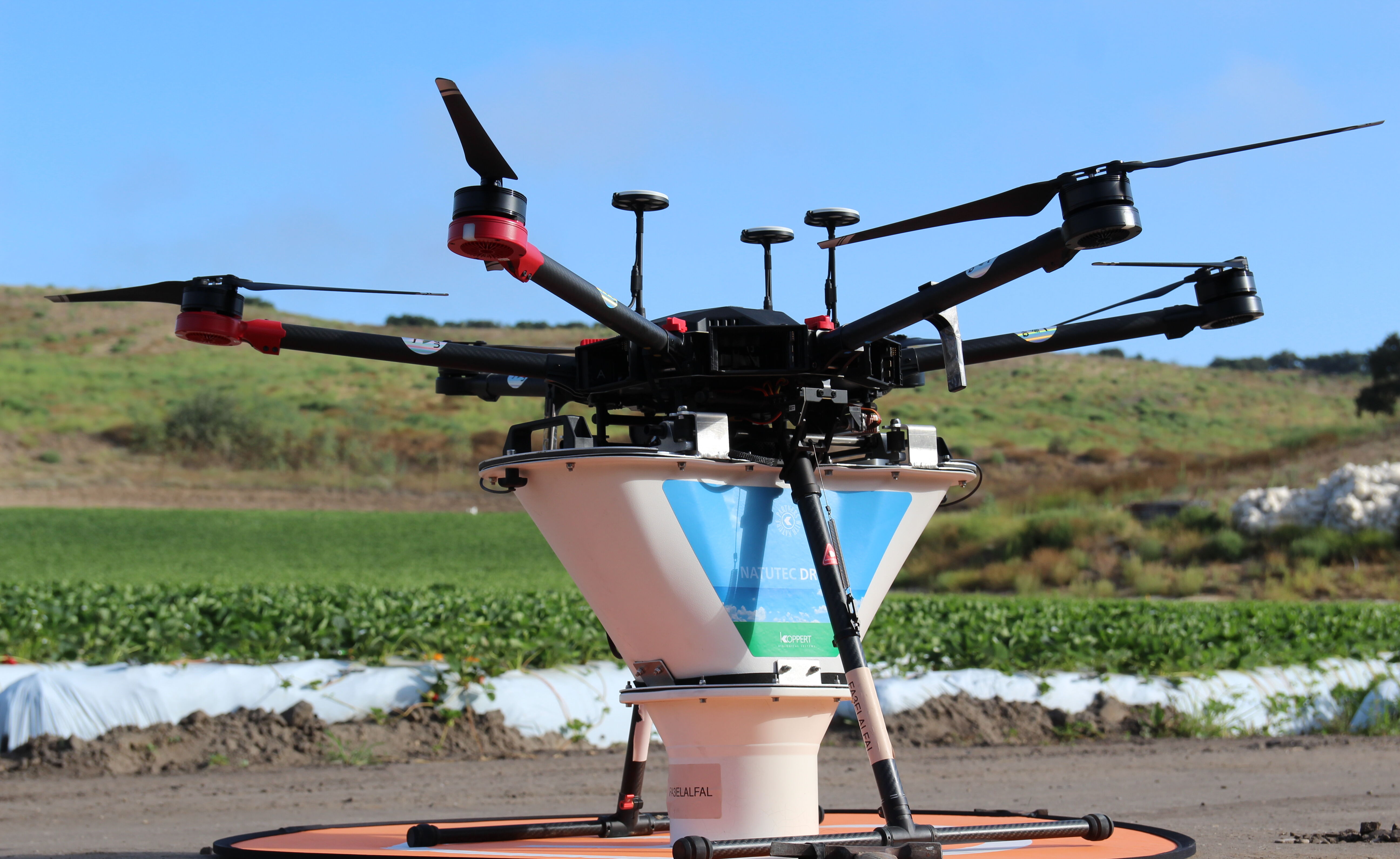 Currently, after extensive trials and research, Koppert can confidently use the Natutec Drone to distribute the biological solution, Spidex, used in the control of the two-spotted spider mite, Tetranychus urticae in strawberry fields. In addition, laboratory and field trials have been carried out with the multi-carrier release system for the dispersal of Koppert’s other biocontrol products such as, Spical, Swirski, Thripex, Limonica, Cryptobug-L, and Chrysopa to combat a range of pests such as spider mites and thrips, in a variety of crops.