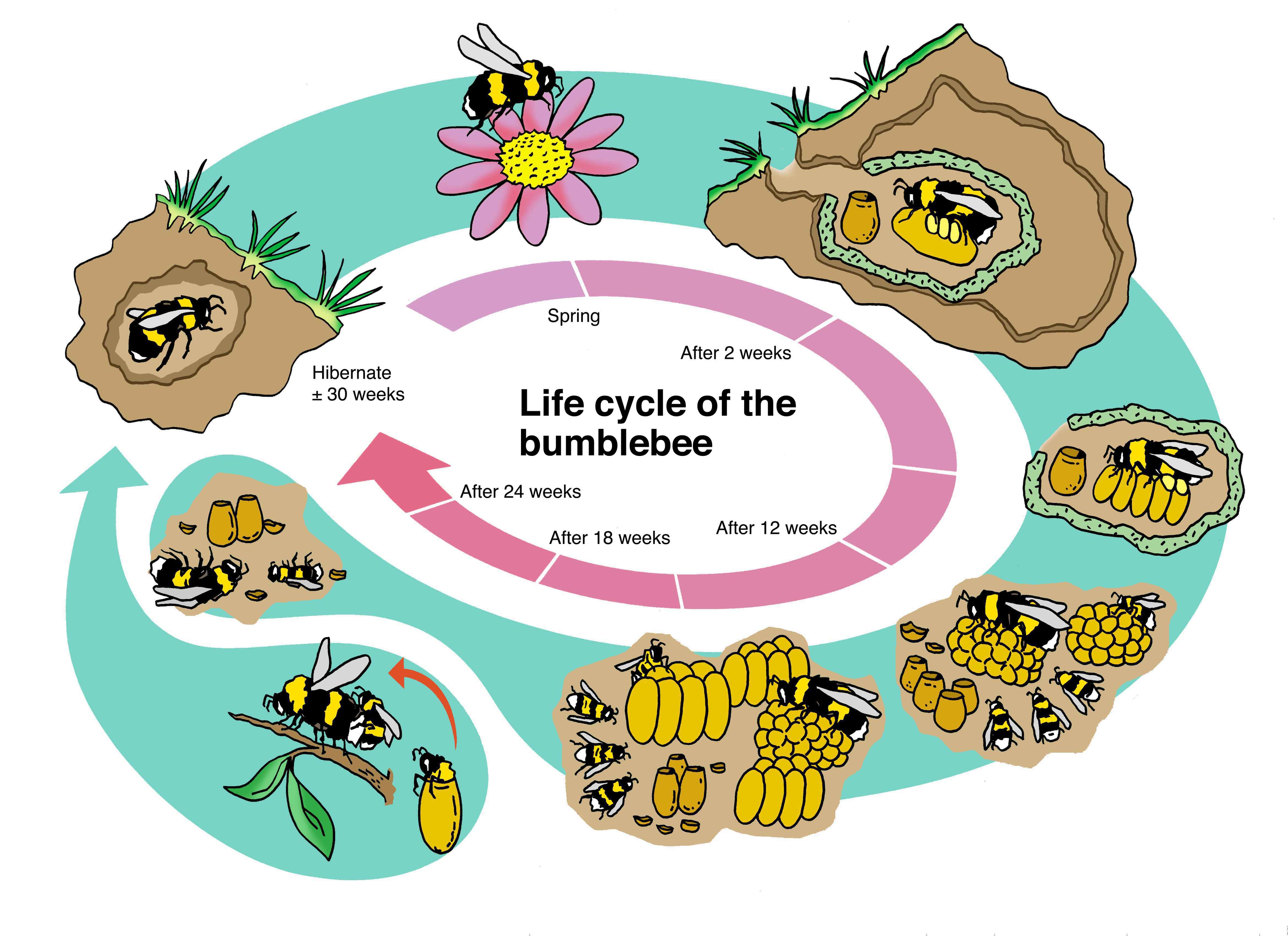 A queen bumblebee hibernates alone and underground throughout the winter season. Before hibernation, a new queen will leave the nest and mate, with a drone. As temperatures rise and the spring season emerges, the new queen bumblebee awakens. She will start forging for pollen and nectar, as well as search for a suitable nest site. Once a nest is chosen, she will start laying eggs to build her own colony. Approximately 4 weeks after the first eggs are laid, the first worker bumblebees (all females) start emerging and carry out work both inside and outside the nest. Worker bees forage for both pollen and nectar to provide resources for brood as well as maintaining the nest. As the nest continues to develop the Queen will not leave the nest, she will remain inside the nest, continuing to lay eggs and providing orders for “workers”. In late summer the Queen will start producing new queen and males (drones) in order for the colony to reproduce. These new queens will mate with males, leave the nest and the cycle will continue. The old queen and her nest will decline naturally in late autumn.